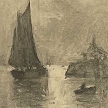 Theodore Casimir Roussel Ships at Anchor Pencil and Charcoal Image: 7” x 6” Frame: 15” x 12” Théodore Casimir Roussel (1847–1926) was an English artist. He began his career in art in his mid twenties, and was mostly self-taught. James McNeill Whistler, as a friend and mentor, was an influence on his work, and they shared a passion for Japanese art. His later work, of which this is an example, was primarily landscapes, painted from his home in Parsons Green. Roussel went on to exhibit regularly with the Royal Society of British Artists, the Royal Scottish Academy, and became a founding member of the Allied Artists’ Association.